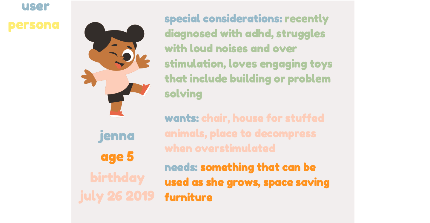 I studied how children ages 5–7 climb, move, and repurpose furniture during play. The brief required a chair with an added function and soft upholstery for comfort and safety. Through sketching and iterative prototyping, I developed modular components that kids can assemble and transform themselves. The final, user-tested design encourages tactile engagement, adaptability, and a sense of ownership through play.